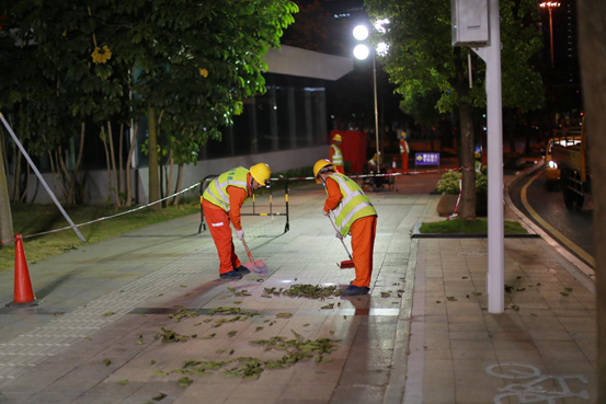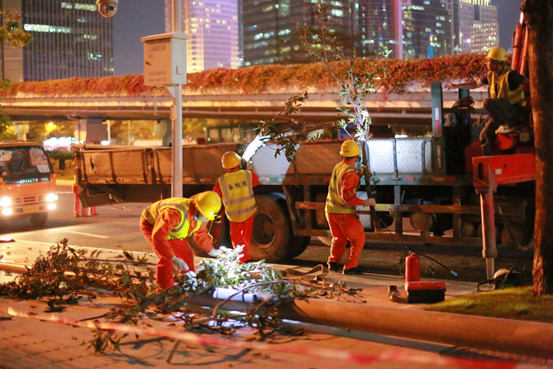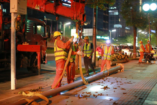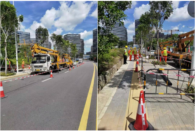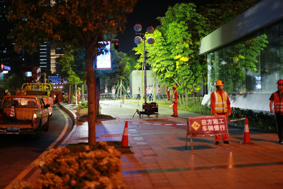 福田路燈維護項目部本次演練模擬場景為某日晚21點,接到中心監控室指令:深南路(北排)與益田路交匯口受暴雨影響發生大面積滅燈,同時該路段樹木被強臺風刮倒,造成一燈桿倒伏,嚴重影響市民出行安全,要求路燈維護單位迅速前往現場處置。